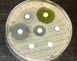 Petrischaal met kleine schijven antibiotica. Des te groter de leegte, des te beter het antibioticum werkt.